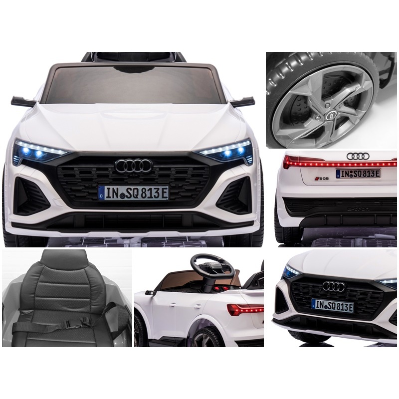 Laste elektriauto Audi SQ8 (valge) - pehmed rattad, nahkiste, pult, liitiumioonaku